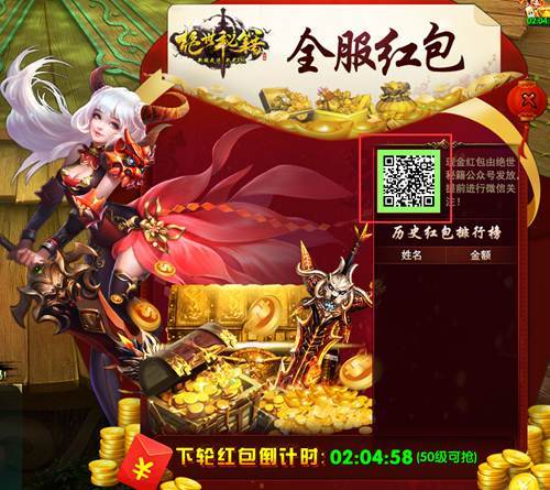 一、点开屏幕右则的“财神图片”,扫二维码关注《绝世秘籍》微信公众号,否则抢到的红包是不能提取的哦!