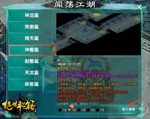 在主城(51,44)有一名叫江湖百晓生的NPC,他就是我们游戏里面的打宝地图传送NPC,游戏一共有7个打宝区域,分别是神龙篇、笑傲篇、倚天篇、神雕篇、射雕篇、天龙篇和侠客篇。