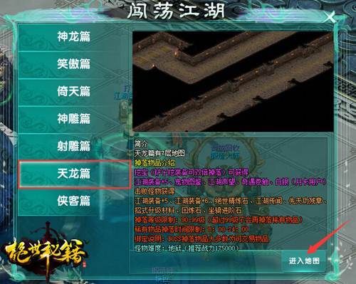 在主城(51,44)有一名叫江湖百晓生的NPC,他就是我们游戏里面的打宝地图传送NPC,游戏一共有7个打宝区域,分别是神龙篇、笑傲篇、倚天篇、神雕篇、射雕篇、天龙篇和侠客篇。