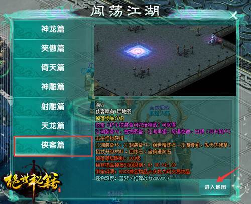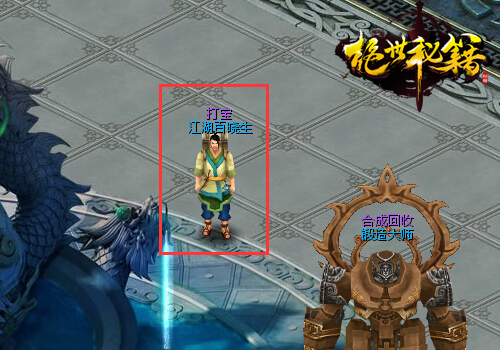 在主城(51,44)有一名叫江湖百晓生的NPC,他就是我们游戏里面的打宝地图传送NPC,游戏一共有7个打宝区域,分别是神龙篇、笑傲篇、倚天篇、神雕篇、射雕篇、天龙篇和侠客篇。