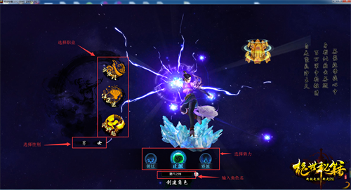 2.新进入玩家开始创建角色,下图上标示了选择势力、职业、性别,选择好后填写自己喜欢的角色名,点击下方创建角色即可。