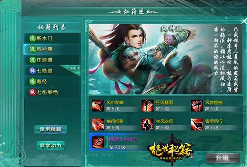 初始创建角色时,玩家可以在三种初始秘籍中选择一个(可选的三个秘籍为刀类的断水门,扇类的任逍遥,手类的风神腿)。