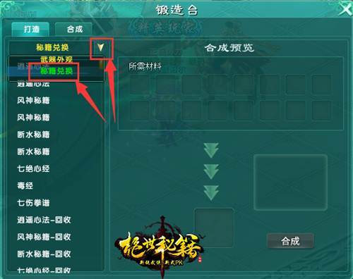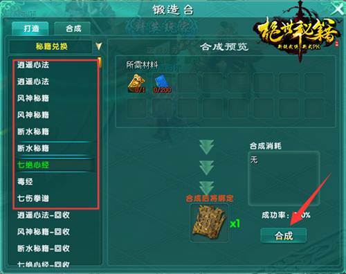 玩家可以在主城锻造大师处(51,46)兑换秘籍。选择打造,点击选择打造,选择秘籍兑换,选择想要合成的秘籍,再点右下角合成,即可完成兑换秘籍。