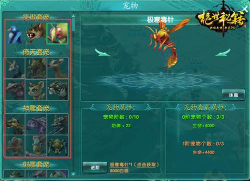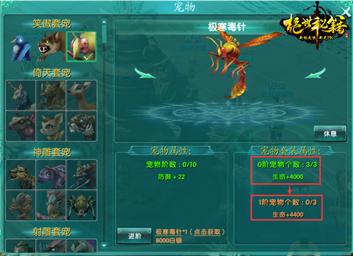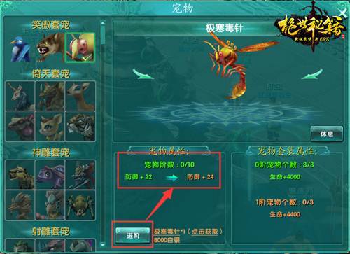 每个宠物可以进阶,进阶后加强宠物附加属性。