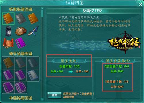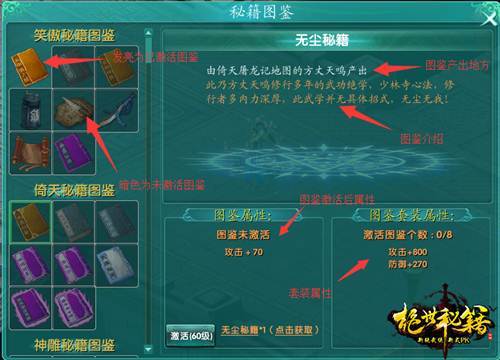 少侠可以点击右下角培养——图鉴图标或者快捷键J即可打开秘籍图鉴界面。界面内有详细的秘籍获得途径,少侠只需要根据提示去杀相应的BOSS即可获得秘籍。等级越高,BOSS越难杀,当然激活后的秘籍套装增加的属性也越高。收集成套的图鉴还能拥有套装属性。