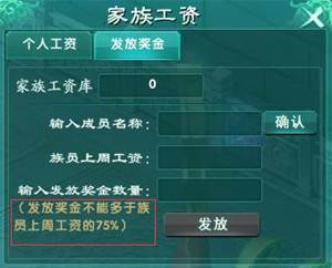 2.家族工资库:上周家族所有成员的工资总和的一半会自动加入家族工资库,参与家族争霸赛第一轮也会增加家族工资库资金(第二轮、三轮报名需要家族资金,胜利后可得双倍资金。)