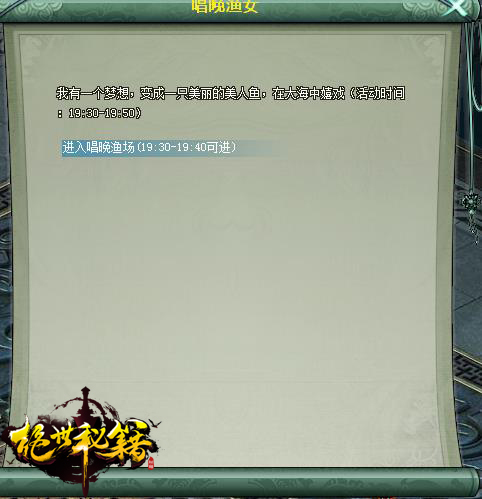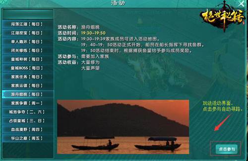 点击参与自动寻路,找到渔舟唱晚活动NPC,唱晚渔女,在活动时间内,对话点击进入。