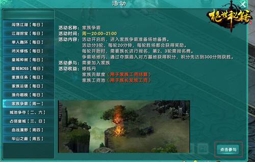 在周一20:00前,玩家可以选择游戏右下角玩法——活动——家族争霸菜单,查看争霸赛活动详情。