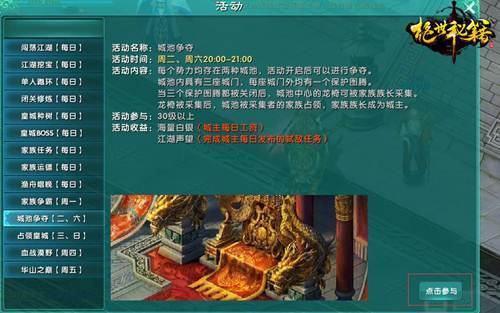 每周二、六20:00前,点击玩法——活动——城池争夺,查看活动,点击参与可自动寻路。