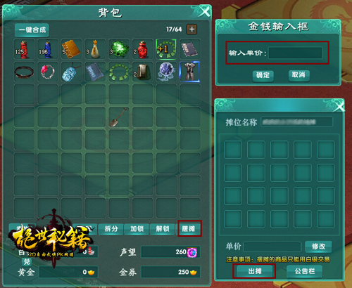 3、侠客们可将想出售的物品点击鼠标右键拖动到摊位,设置好单价后挂在摊位待售;