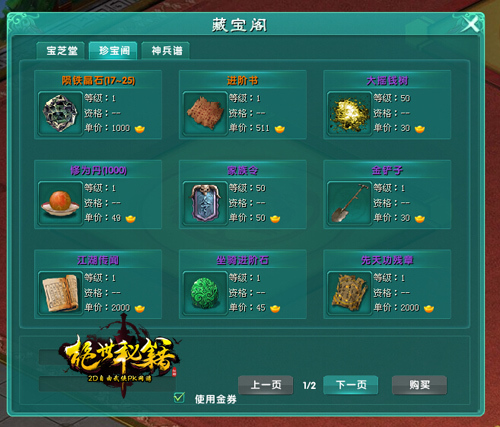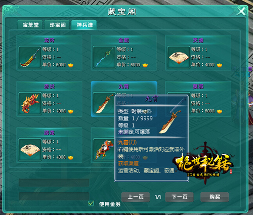 3、藏宝阁中,在宝芝堂可以购买回复药,在珍宝阁可以购买装备升级消耗品等,神兵谱可以购买武器外装。