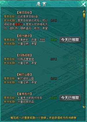 玩家达到50级之后,每天可以完成悬赏任务,以获得大量药品、金券、修为、声望、白银和强化材料。