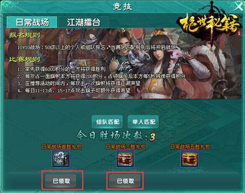 50级以上的玩家,可以参加10V10的日常战场,赢得战斗之后将获得相应的礼包。